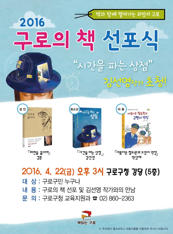 행사에는 지난해 독서릴레이 및 도서 기증 우수자에 대한 시상식, 구로의 책 선포, 경과보고, 작가와의 만남 등이 진행된다. 특히 작가와의 만남에는 청소년 부분 시간을 파는 상점의 작가 김선영씨가 과거의 시간이 현재를 만든다라는 주제로 강의할 계획이다.