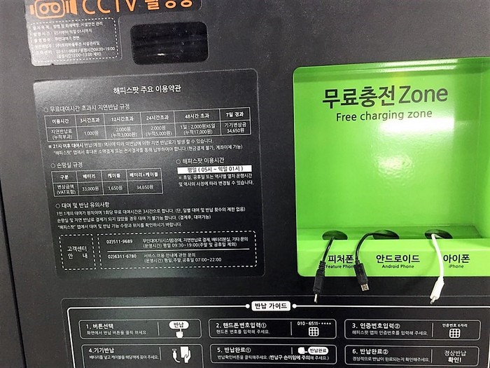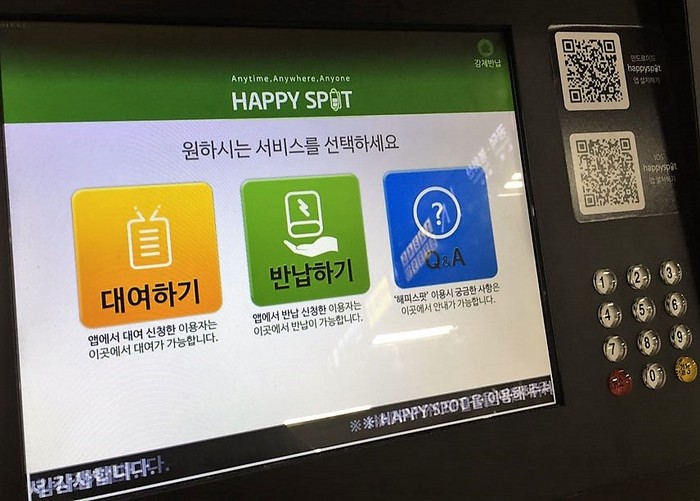 해피스팟 어플을 통해서만 회원가입이 가능하다. 대여/반납은 대여절차는 어플(대여예약), 무인대여기(대여하기클릭), 회원클릭(비회원은 회원가입), 핸드폰번호입력, 어플(인증번호확인) 등을 하면 된다.