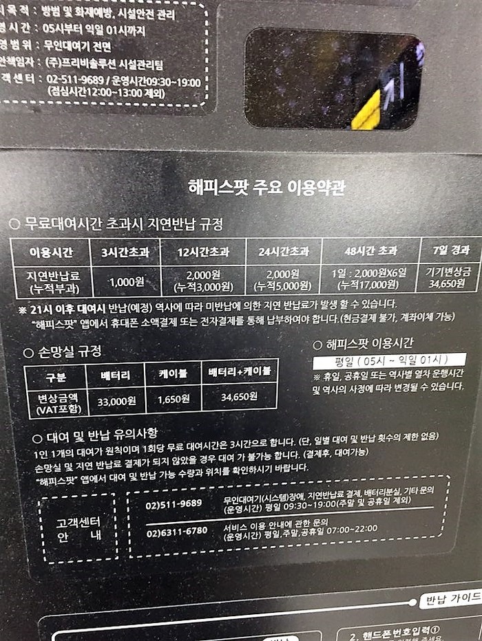 무료이용시간은 3시간이며, 3시간 초과 시 지연반납료가 부과된다. '해피스팟'은 무인대여기의 이용시간은 평일기준 05시 부터 익일 01시까지 사용 가능하다.
