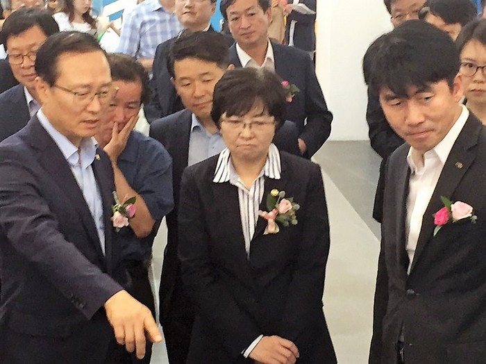 | ▲환경산업의 3인방인 홍영표 국회 환경노동위원장(사진 왼쪽), 김은경 환경부 장관(중앙), 남광희 환경산업기술원장(오른쪽)이 연구단지내 마련된 상설 전시관을 둘러보고 상용화된 녹색기술과 제품을 살펴보고 있다. |