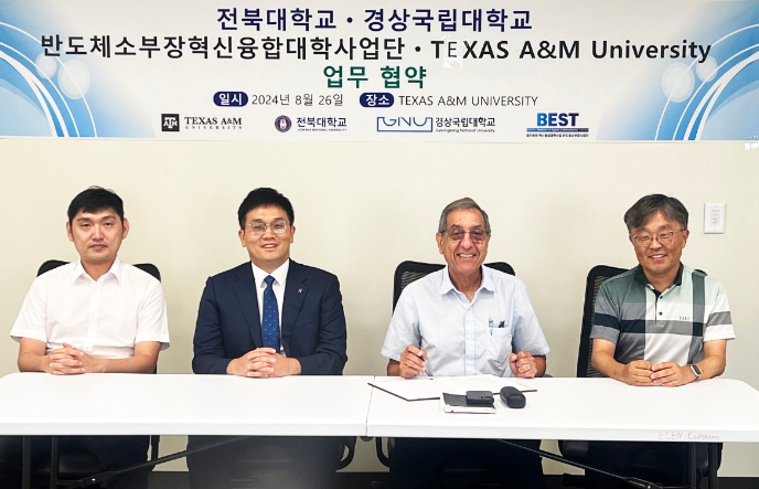 이번 협약 체결은 경상국립대 반도체 소재·부품·장비(이하 소부장) 사업단 김정식 사업단장(전기공학과 교수)과 Texas A&M 대학교 CSE의 코스타스 조르지아데스(Costas Georghiades) 학부장 간에 이뤄졌다.