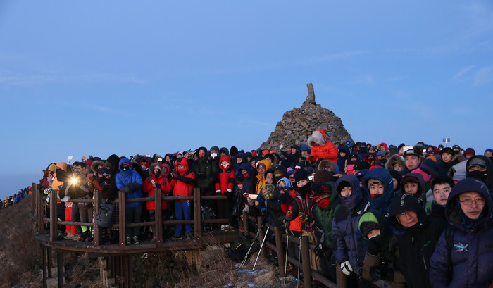 붉은 닭의 해를 맞은 지리산 노고단에는 수백여명이 찾아 발 딛을 틈 없이 노고단 정상을 가득 메웠다.