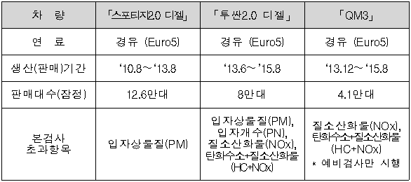 본검사 결과 6개 차종 중에서 ▲스포티지2.0 디젤 ▲투싼2.0 디젤 ▲QM3 3개 차종은 배출기준을 초과한 것이 최종 확인됐다.