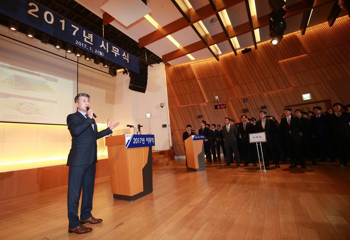 | ▲동국제강 2017년 시무식에서 장세욱 부회장이 임직원들에게 신년메시지를 전달하고 있다. |