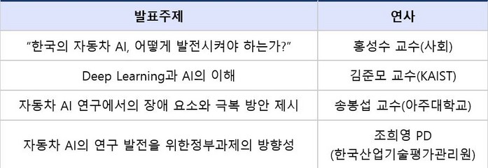 19일에 국내 AI 분야 전문가를 모시고 '한국의 자동차 AI, 어떻게 발전시켜야 하는가?'주제의 포럼을 진행할 예정이다.