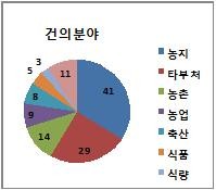 분야별로 농지 41건(34.1%), 타부처 29건(24.1%), 농촌 14건(11.7%) 등으로 농지분야에 대한 규제개혁 요구가 가장 높고, 농업의 6차산업화 추진으로 관계부처의 협조가 필요한 과제에 대한 건의가 크게 증가했다.
