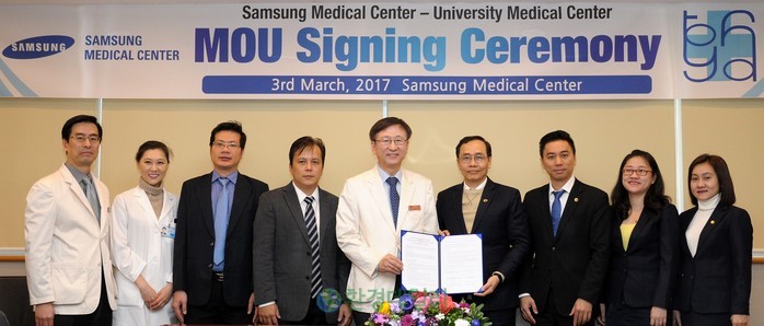 ▲삼성서울병원 권오정 원장과 베트남 호치민 의대 트루우 창 빈 부원장(협약서 든 중앙) 은 3월 3일 베트남 호치민 의대와 2년간 의 MOU를 체결하고 기념촬영을 했다. |