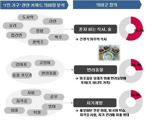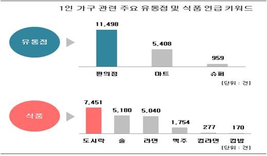 먹거리에 대해서는 간편식 위주의 도시락·라면 등에 대한 언급이 높았고 먹거리 구입 장소로는 편의점 언급량이 마트의 2배 이상이었다.