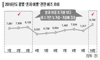 여행 분야는 '혼자여행(혼행)'에 대한 관심이 꾸준히 증가했다. 성수기인 여름휴가 철보다 비수기인 늦가을·겨울에 관심이 집중됐다. 외롭다는 부정적 감성어도 나타났지만 편하고 자유롭다는 긍정적 감성어가 우세했다. '혼행'의 불편 요소로 1인 숙소, 1인분 식사를 찾기 어렵다는 점을 지적했다.