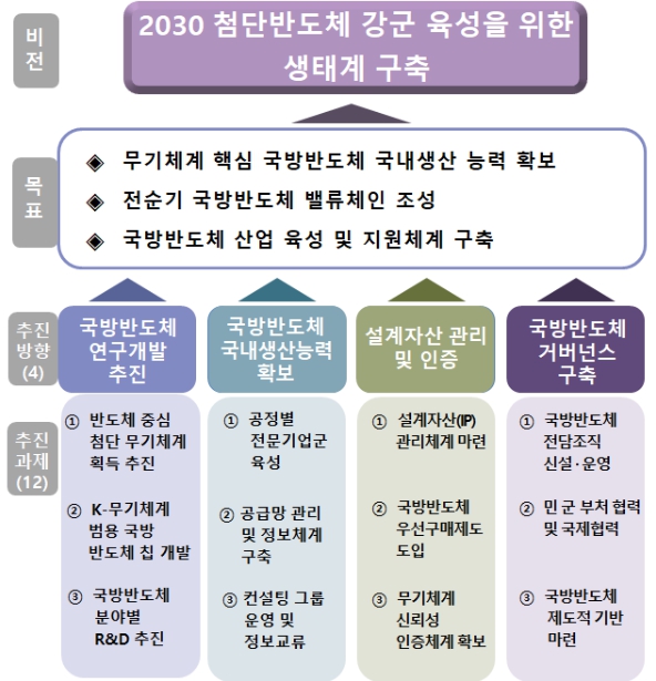 방위사업청은 미래 군사안보와 첨단무기의 안정적인 획득에 필수적인 국방반도체 산업생태계를 구축하기 위해 ‘K-무기체계 범용 국방 반도체 칩 개발’ 등 12개 과제를 제시하고, 과제 수행을 위해 ‘국방반도체 산업 지원에 관한 법률’을 제정이 필요하다는 당위성을 강조했다. 포럼에 참여한 각계각층의 전문가들도 발전전략의 핵심내용에 적극 찬성하며 법적기반 마련이 필요하다는 점에 공감했다.