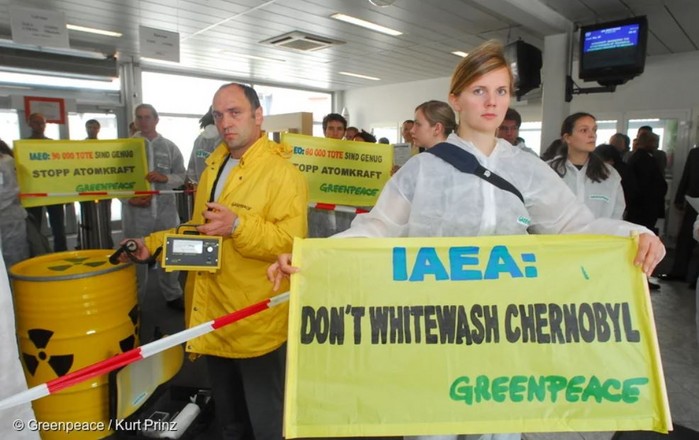 | ▲2006년 그린피스 캠페이너가 IAEA 건물에서 1986년 체르노빌 원전 사고의 결과를 경시하는 IAEA의 비전문적 태도를 경고하는 모습 |