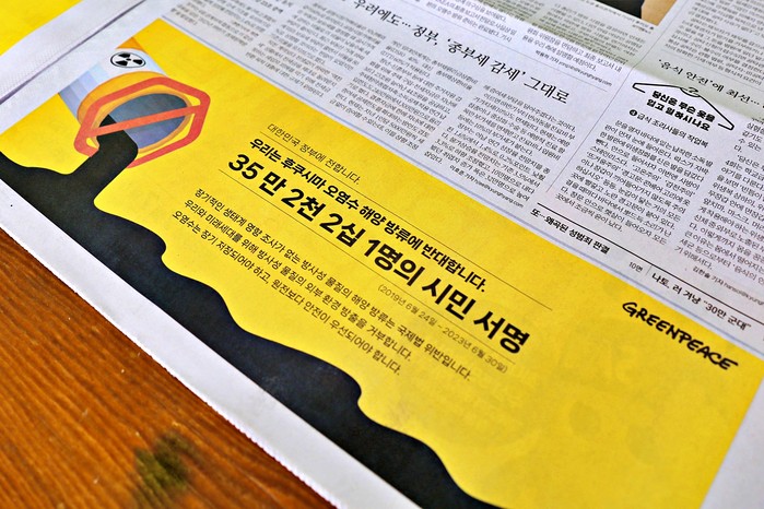 | ▲7월 5일, 그린피스는 후쿠시마 오염수 방류를 반대하는 한국 시민 35만 2천 2십 1명의 서명을 신문광고로 한국 정부에 전달 |