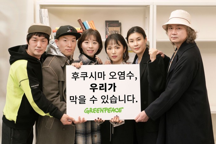 | ▲오염수 해양 방류 반대 의지와 응원을 담아 직접 메시지 카드를 들고 사진 촬영에 임해준 밴드 이날치. 1집 수궁가의 '의사줌치'를 편곡, 개사해 뮤직비디오 <후쿠시마 오염수 (feat. 그린피스)>에 담았습니다. |
