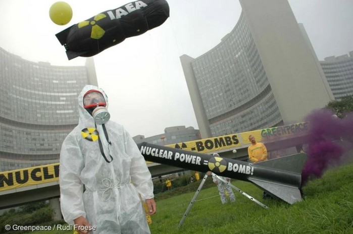 | ▲2005년, 그린피스가 IAEA 연차 총회 개막일에 원전을 홍보하고 핵무기 확산을 방조하는 IAEA를 규탄하는 모습 |