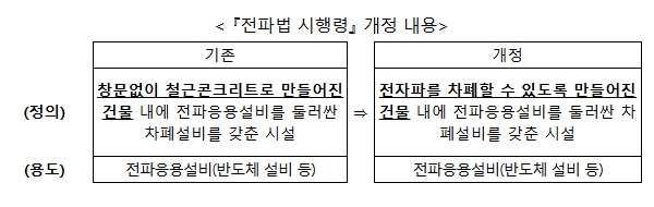 이번 시행령 개정은 반도체 제조시설 등에서 사용하고 있는 전파응용설비의 검사 부담 완화를 위해 철근콘크리트 건물 외에 합성벽 등 다양한 건물도 다중차폐시설로 인정할 수 있도록 하여, 시설자의 경제적‧행정적 부담을 완화함에 의미가 있다.