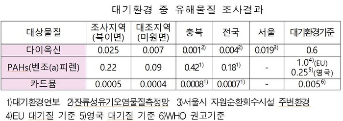 토양에서 검출된 다이옥신 평균 농도(0.447pgI-TEQ/g)는 충북·전국보다 낮았고, 카드뮴(0.09mg)도 전국 평균(0.156mg)과 토양오염우려기준(4mg) 보다는 낮은 수준이었다.