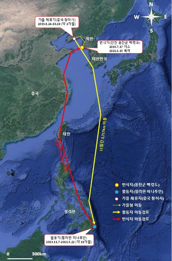 노랑부리백로는 2019년 11월 7일부터 약 18개월을 월동지인 필리핀에서 계속 머물다 올 5월 22일 북상을 시작해 대만, 중국 장쑤성과 산둥성 등 중국 동해안을 따라 이동했다. 다음 달인 6월 9일 서해를 건너 평안남도 온천군으로 도착한 후, 6월 15일에 번식지인 백령도로 되돌아왔다. 월동지에서 번식지까지의 이동 기간은 24일이었으며, 총 3573km를 이동했다.