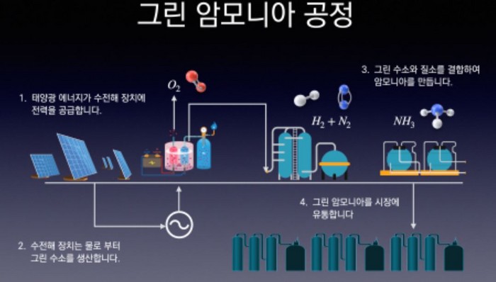 그래서 상대적으로 합성이 용이하고 이송이 쉬운 암모니아(NH₃)로 변환하는데 그 중에서도 재생에너지를 기반으로 생산한 그린 수소를 변환한 것이 그린 암모니아다.