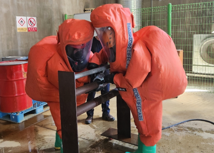 평가 내용은 ▲화학물질 식별 및 정보 확인 ▲A급 화학보호복 착용 후 인명구조 ▲C급 보호복 착용 후 경계구역 설정 등 3개 공통 과제와, ▲누출 방지(백·밴드·슬리브 사용) ▲고압 누출 차단 호스 사용 ▲간이 인체 제독 텐트를 이용한 대원 제독 등 3개 추첨 과제로 진행됐다.