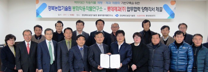 [화학신문 유혜리 기자]롯데제과(대표이사 김용수)와 경상북도 농업기술원은 1월 10일(화) 봉화약용작물연구소 강당에서 양측의 관계자와 농업인 등 20명이 참석한 가운데 '백두대간 약용작물 제빵 제품화 기반 구축 MOU'를 체결했다고 11일 밝혔다.