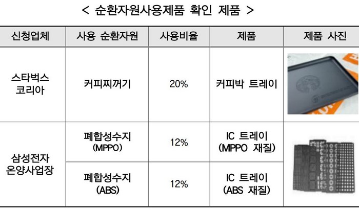 국내 1호 순환자원사용제품 확인서를 받게 될 '스타벅스 커피박 트레이'는 제품 제조 원료의 20%를 스타벅스 매장에서 쓰인 커피찌꺼기로 만든 쟁반이다. '삼성전자 IC 트레이'는 삼성전자 온양사업장의 반도체 공정에서 사용한 폐 IC 트레이를 분쇄 이를 제품 제조 원료의 12%를 사용한 제품이다.