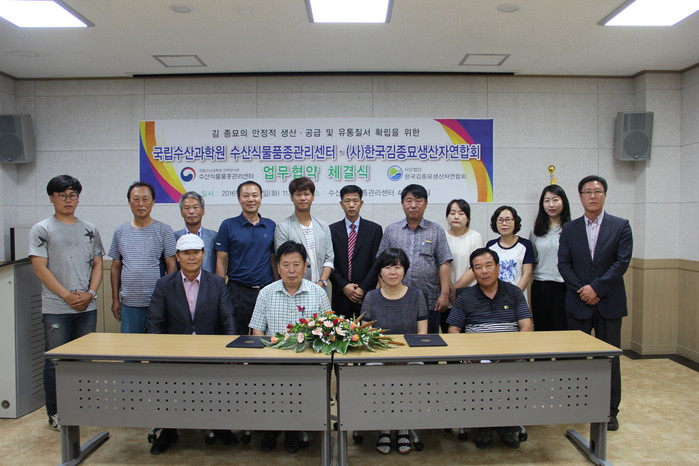 ▲해양수산부 국립수산과학원(원장 강준석) 수산식물품종관리센터와 (사)한국김종묘생산자연합회(회장 박제춘)는 8월 9일 김 종 자의 안정적 생산·공급과 유통질서 확립을 위해 업무협약(MOU)을 체결했다고 밝혔다. |