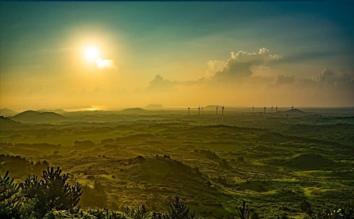 | ▲동검은이오름에서 바라본 제2공항 예정지, 멀리 왼쪽에서부터 우도와 성산일출봉, 대수산봉이 보인다. 동검은이오름은 제주시 구좌읍에 위치한 해발 324m로 제주2공항 부지가 한 눈에 들어오는 곳이다. 이곳 역시 비행이착륙으로 간접적인 영향을 받게 된다. |