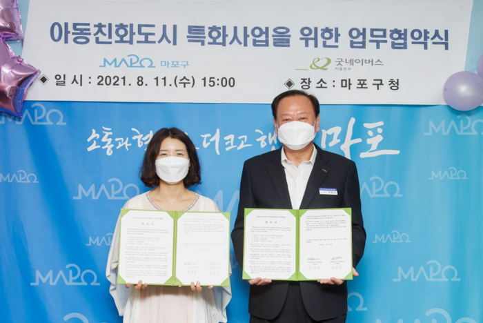11일 마포구에 따르면, 유엔아동권리협약을 기반으로 체결한 이번 업무협약은 마포구와 굿네이버스 서울본부가 아동 건강 및 위생 실천을 강조하는 '해피워시 앤 버블(HAPPY WASH & BUBBLE)' 사업 추진에 있어 상호 협력한다는 내용을 담고 있다.