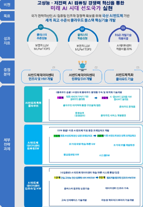 동 사업은 국산 인공지능 반도체에 특화된 데이터센터 기반 시설(인프라) 및 하드웨어, 컴퓨팅 소프트웨어, 인터넷 기반 자원공유(클라우드) 등 3개 전략분야 28개 세부과제로 구성되어 있다. 올해는 기반 시설(인프라) 및 하드웨어 분야 5개 과제, 컴퓨팅 소프트웨어 분야 9개 과제, 인터넷 기반 자원공유(클라우드) 분야 3개 과제 등 총 17개 과제에 대해 공모했으며, 선정평가 및 사업심의위원회 심의를 통해 신청한 39개 연합체 중 기술력과 사업화 계획이 우수한 17개 연합체, 총 59개 연구개발기관을 선정했다.