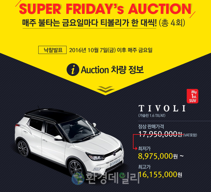 [화학신문 최진경 기자]쌍용자동차가 글로벌 쇼핑관광축제인 2016 코리아세일페스타 개최를 기념해 누구나 참여할 수 있는 티볼리 경매 이벤트 '슈퍼 프라이데이 옥션'을 실시한다고 5일 밝혔다.
