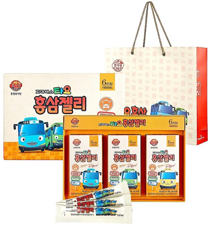천지인 꼬마버스 타요 홍삼젤리는 국내산 사과농축액을 담아 홍삼의 쓴맛을 싫어하는 어린이들도 맛있게 먹을 수 있는 젤리 형태의 홍삼이다. 동원F&B가 직접 수매하고 만든 6년근 홍삼농축액을 사용했다.