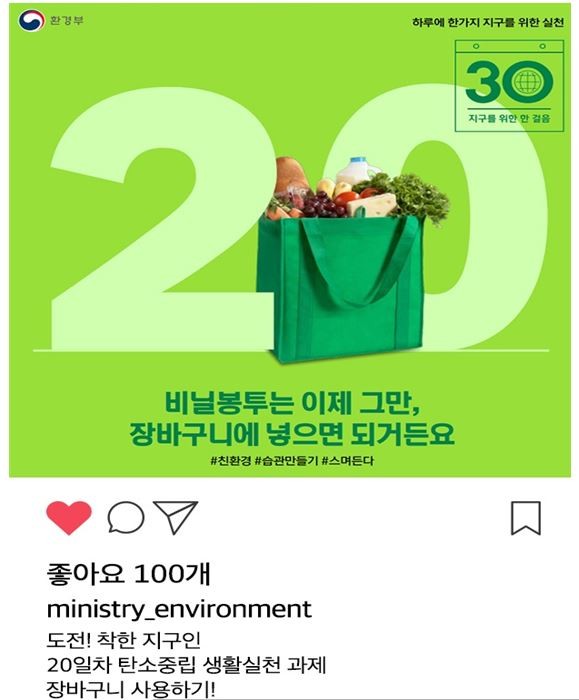 '하루 한 번 지구를 구하라!'는 주제로 매일 1개의 탄소중립 생활 실천안이 담긴 그림 카드가 환경부 인스타그램에 게재된다.