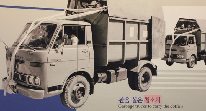 관을 옮겨 싣을 차가 없어, 청소차량에 포개 이동했다는 기록도 있다.