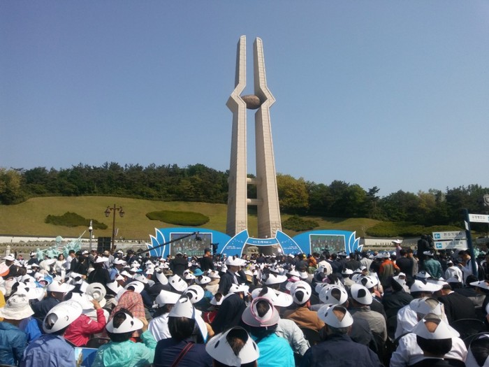 민주화운동기념식 인쇄가 된 종이모자를 뚫을 기세였다. 대통령이 참석하는 국가 공식 기념식인데, 신분확인도 없어 모여들었다.