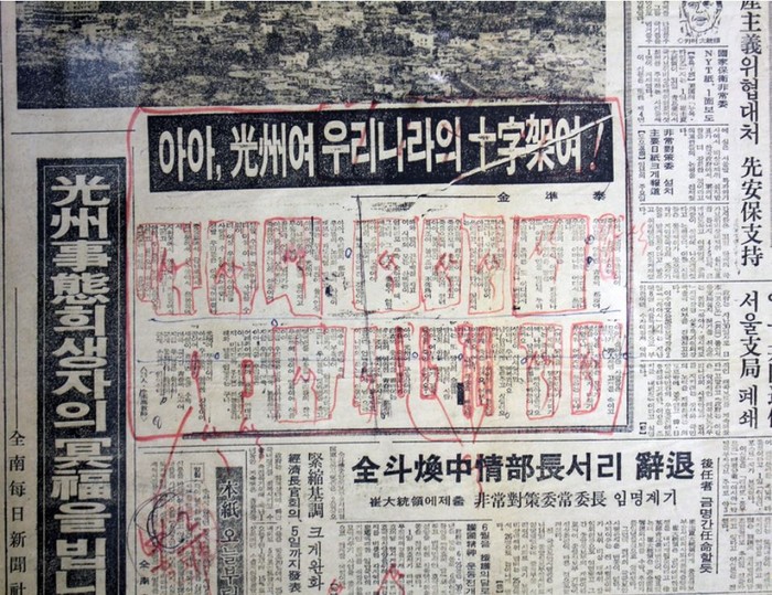 | ▲5.18광주민주화운동 관련 기사를 검열에서 삭제한 당시 전남매일신문 1면 |
