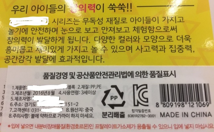 설령 경고문구가 새겨져 있다고 해도, 눈에 띄지 않았고, 장난감 주원료와 첨가 성분이 무엇인지도 전혀 알수 없게 표시됐다.