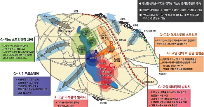주요 내용으로는 5040년 고양가와지볍씨 등 역사 스토리를 살린 일산문화공원에서 한울광장까지 G-웰컴센터와 역사 스토리 스트리트 구축, 호수공원의 메인 무대인 한울광장에서 이동형 무대차량과 공개스튜디오 등 거리 문화 활동이 전개되는 G-시민문화스퀘어 조성, 고양600년 기념관, 평화통일교육전시관과 고양국제꽃박람회의 글로벌 콘텐츠를 상설화 시키는 G-미래정책 빌리지를 골자로 한다.