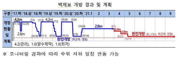 환경부는 농민들의 용수 부족 우려가 없도록, 물 사용이 많은 겨울철 수막재배 시기에는 수문을 닫아 관리수위(EL. 4.2m)를 유지했고, 여름철 물 사용이 상대적으로 적은 시기를 중심으로 개방해왔다. 또한, 지하수 이용에 문제가 확인된 지역에 대체관정 개발 등 물 이용 대책을 실시했으며, 그 결과 지난해 동절기에 처음으로 예년처럼 백제보 수문을 닫지 않고 부분개방(EL. 2.8m) 상태를 유지했다.