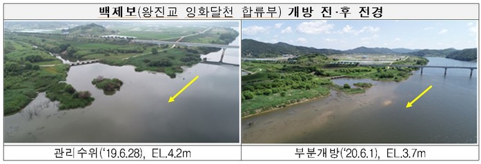 그 중 한곳인 백제보 개방을 위해 환경부는 농민, 지자체, 환경단체, 전문가 등 관계자가 참여하는 민관협의체 논의를 거쳐 4월 1일 백제보 개방에 착수했고, 5월 11일 완전개방 된다고 밝혔다. 앞서 세종보는 2018년 1월 24일부터, 공주보 2018년 3월 15일부터 완전 개방을 유지 중이다.