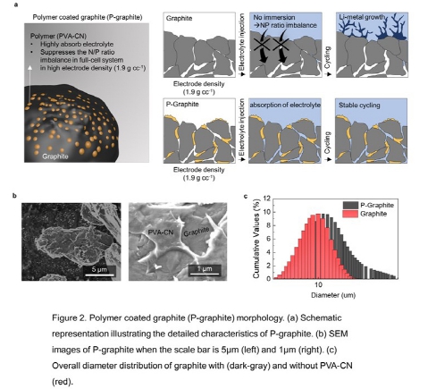 연구 결과는 국제 저명 학술지인 《머티리얼스 케미스트리A(Journal of Materials Chemistry A)》 (IF: 10.7)에 207월 30일 자로 발표됐다. (논문명: Achieving High Volumetric Energy Density in Graphite Anode through Polymer Coating with Improved Electrolyte Impregnation)