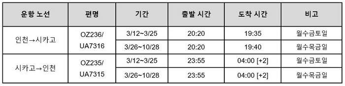 한편, 아시아나항공은 주 5회 20시20분 출발 인천~시카고(OZ236), 23시55분 출발 시카고~인천(OZ235)를 운영하고 있다.