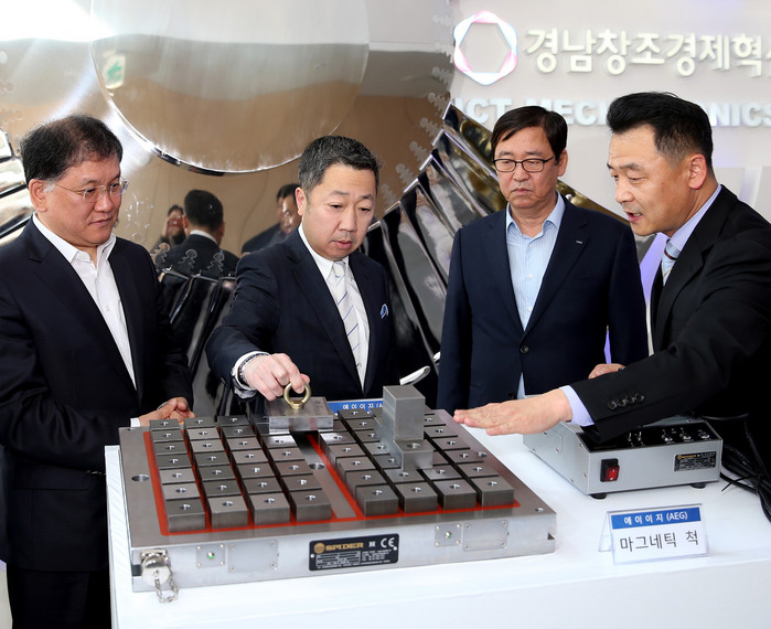 이어 경남창조경제혁신센터를 방문해 입주 기업 중 하나인 에이이지가 개발한 공작물 지지대 시제품에 대한 설명을 듣고 있다.