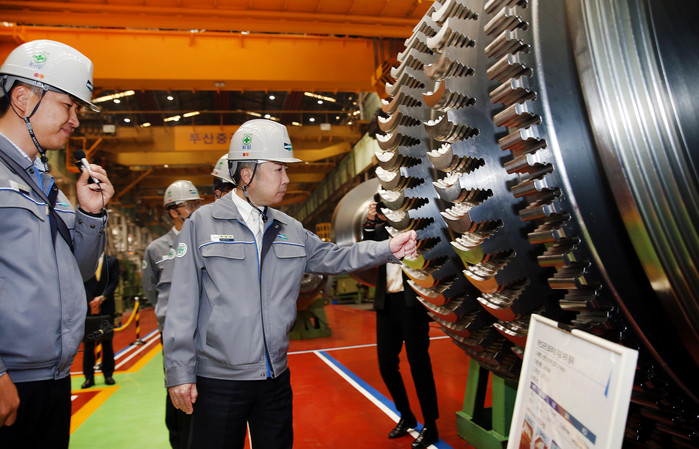 박정원 회장은 이날 터빈공장에서 발전소용 저압터빈로터를 살펴 보고 있다.