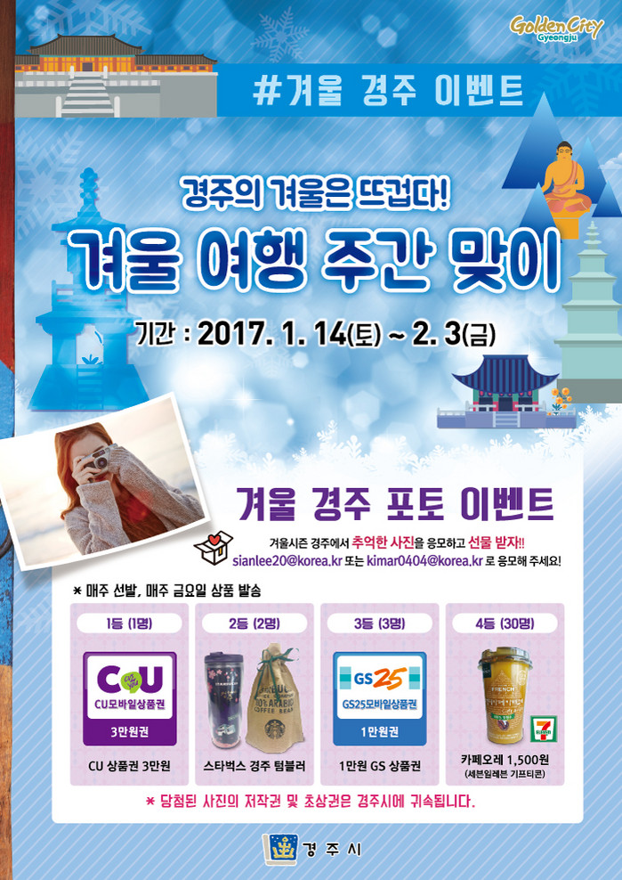 깜짝 이벤트로 겨울철 경주에서 찍은 사진을 응모하는 겨울경주 포토이벤트와 기존 경주스탬프 앱의 관광지와 기능을 확대한 뉴 경주스탬프 앱을 설치하고 가까운 관광안내소를 방문하면 선착순에 한해 소정의 상품을 받는 뉴 경주 스탬프 이벤트를 진행한다.