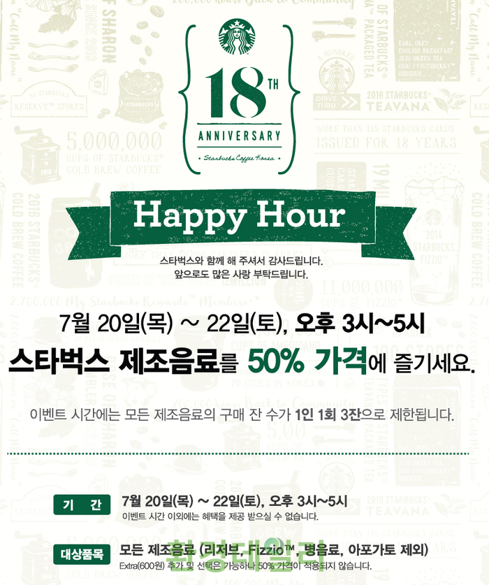 이번 해피아워 이벤트는 스타벅스커피 코리아의 개점 18주년을 기념해 실시되며 매장에서 바리스타가 제조해 제공하는 음료를 50% 할인된 가격에 만나볼 수 있다. 이벤트를 통해 할인혜택으로 구매 가능한 음료 수는 하루 1인 1회 총 3잔이며, 드라이브 스루 매장의 경우 구매 가능한 음료는 차량 1대 당 총3잔으로 제한된다. 스타벅스 리저브, 리저브 콜드 브루, 피지오, 청담스타점 전용음료, 아포가토, 병음료 등 일부 음료는 해당 이벤트에서 제외된다.