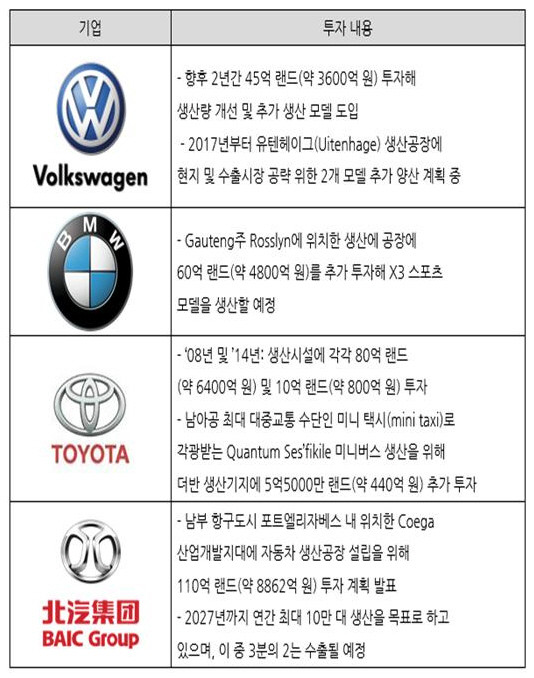Volkswagen, BMW, Ford, GM, Nissan, Toyota 등의 다국적 자동차 기업들 모두 남아공 자회사를 세운 지 오래다.