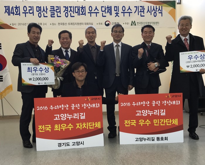 [화학신문 이수진 기자]고양시(시장 최성)의 '고양누리길'이 지난 6일 산림청 주최 '제4회 우리명산 클린경진대회'에서 지자체 부문 최우수상(1위)과 산악단체 부문 우수상(2위)을 수상하는 쾌거를 이뤘다. 이는 2014년 우수상, 2015년 장려상에 이은 3번째 수상이다.