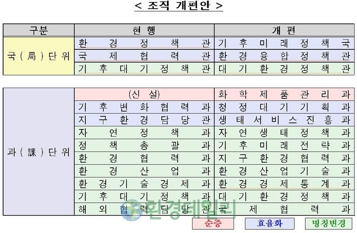 더불어 기후변화 등 미래환경행정 수요에 대응역량이 부족하다는 자체 진단에 따라 미래변화에 선제적으로 대응하고 물, 대기 등 매체융합을 강화하기 위한 조직 개편도 병행한다.