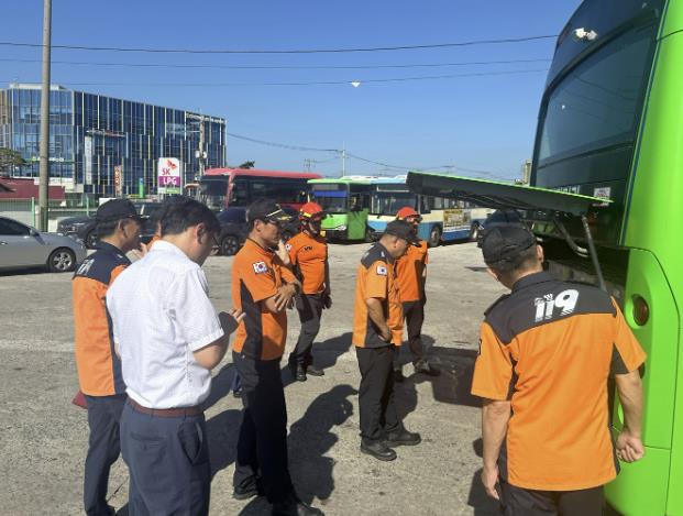 김상식 소방서장은 실제 전기 버스를 확인하며 ▲전기버스 해체 후 배터리 구조, 위치 확인 ▲전기 버스 화재 발생 시 초기 대응 및 인명피해 방안 논의 ▲차고지 및 충전시설 화재 예방 당부 및 예방 교육 등을 실시했다.