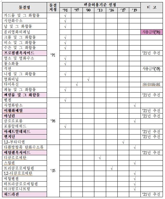 현재까지 총 25종에 대한 배출허용기준이 설정됐으며, 이번에 8종의 배출허용기준을 추가로 설정함에 따라 특정대기오염물질 35종 전체에 대한 배출허용기준이 정해졌다.